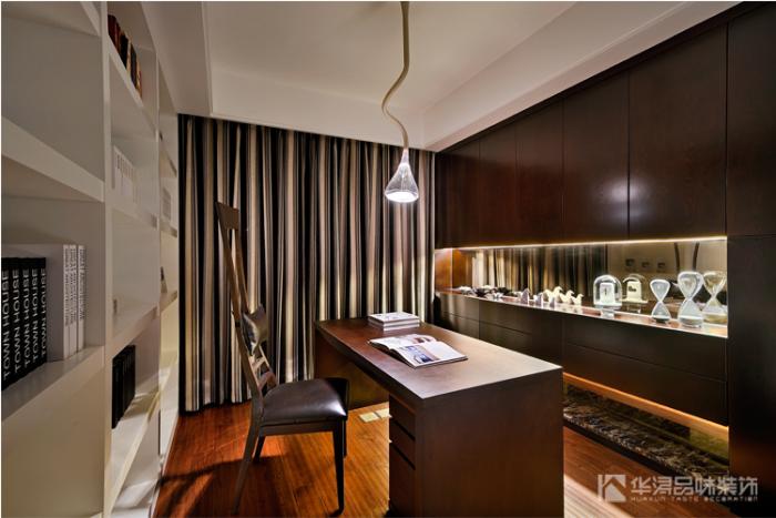 5 k4 z( _$ b' J' G7 Q, C& T' d书房白色与咖色书架形成强烈对比,特色吊灯与弓背靠椅结成和谐组合,宁静而安详。主卧室床头以隔断式条形造型软包为背景,衬以粉色墙纸、手抓纹实木地板,稳重而舒适。相连的“L”型木质小书桌更为主人增添一隅学习和休闲的空间。休闲区以白色为主色调,明亮宽敞,数椅数柜点缀,既可静坐窗前,流连于无涯书海,寄情于千锺粟、颜如玉之间;亦可置三五清茗,邀三五挚友,坐而夜谈,其惬意未可言表,其情趣油然而生。 8 l" t0 f( w5 q