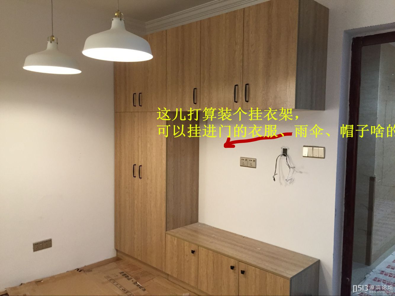 换个角度,吊柜下面到时装上挂衣钩,会很方便,照片也有点色差,实物更温馨点