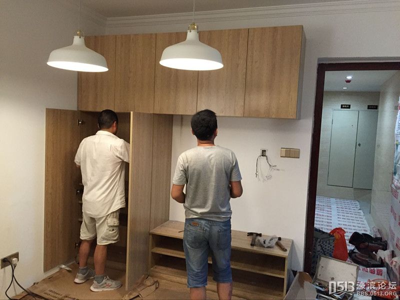 地板铺好了,就可以安装鞋柜了,鞋柜的设计当时考虑了很久,自己也很期待,还是上次橱柜安装的几个师傅,晚上6点了还赶来我家装,十分感谢,装橱柜感觉就像是大人玩的拼积木,都是各种预制件拼在一起 ,忙活了好一阵,晚上8点弄好了,十分满意哈
