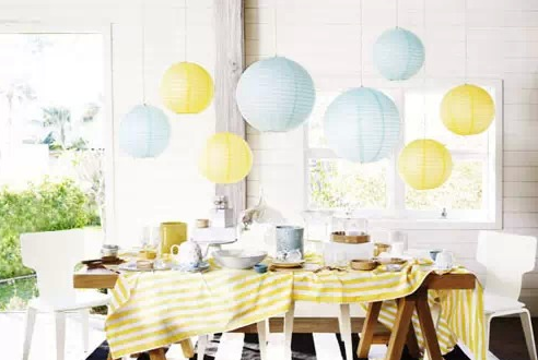 野炊一样的餐厅布置,特别是纸糊的吊灯特别有个性,下方的黑白条纹地毯也是给淡色系的餐厅添加了一抹重色调。* c+ ^: i$ S8 Q' t, P