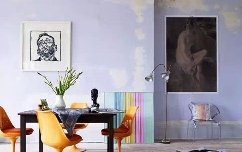 紫色的墙面让整个餐厅都带上了点点浪漫的感觉,橘黄色的用餐椅是空间中的色彩调剂,增加了空间的亮色感。: R8 |3 p9 G' H; a) g' |8 \