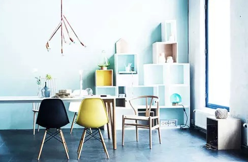 : }& Q& q c* a `0 t 蓝色空间靠墙排列的开放式收纳柜很有特点,加上餐桌椅完全是简约宜家风格,整个餐厅用餐环境就显的特别舒适。5 X: {; j: k8 e5 S: U