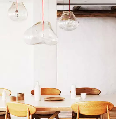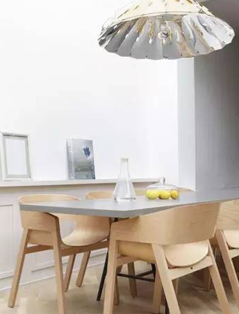 很有特色的吊灯,下方的餐桌椅有着圆润的外观以及流畅的线条感。原木色和周围的墙壁以及地板色彩一致。$ ?6 V1 W# v" l' R