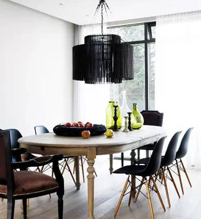 - z+ |$ n% ]' a5 l8 v3 ~; p 黑色的吊灯很是显眼,不仅在色彩上度人眼球同样的造型外观也彰显着个性。下方那个的餐桌椅延续了同样的优雅风格。