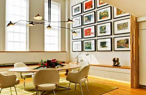 餐厅所在的空间有很不错的装饰画点缀,靠墙边还有收纳设计,中间位置放置了地毯,很容易的就圈出了一个用餐区域。