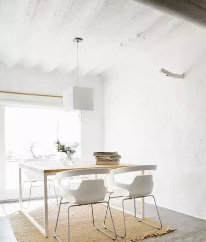 纯白空间,墙面就采用了凹凸不平的设计方案,后方的玻璃墙让阳关可以直接到到室内,地上的草席和整个餐厅的气质相符合。