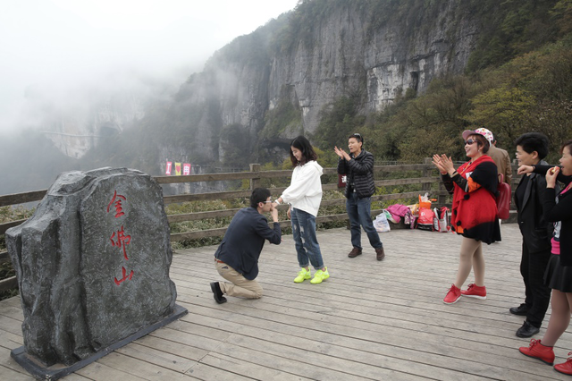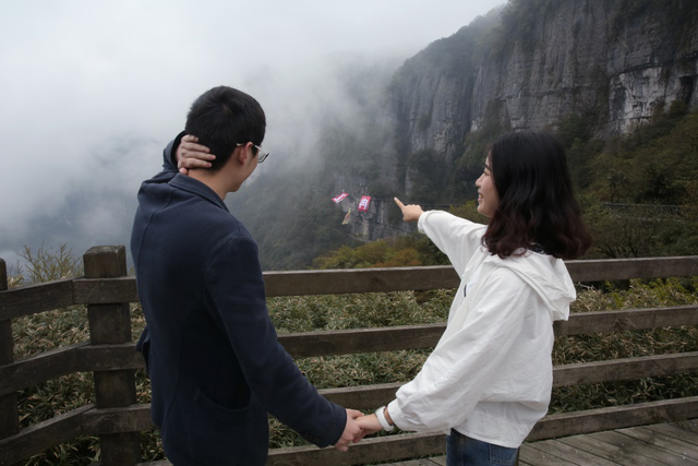 “嫁给他!嫁给他!”现场所有的游客都成了小盛的助威团,鼓掌惊呼声不断,而小盛自然是得意洋洋满心欢喜。 突然,围观人群中有人惊呼:帅哥,你的情书飞啦!果然,只见悬挂在千米悬崖上的巨幅情书,在崖壁飓风的吹打下,居然开始滑落,原本整整齐齐的三个大字,一下子变得七倒八歪……围观的游客中有人开始哈哈大笑。 “我当时真想打个地洞钻进去,太丢脸了。”小盛一脸窘态,而刚才还满脸幸福的女友,也是哭笑不得。