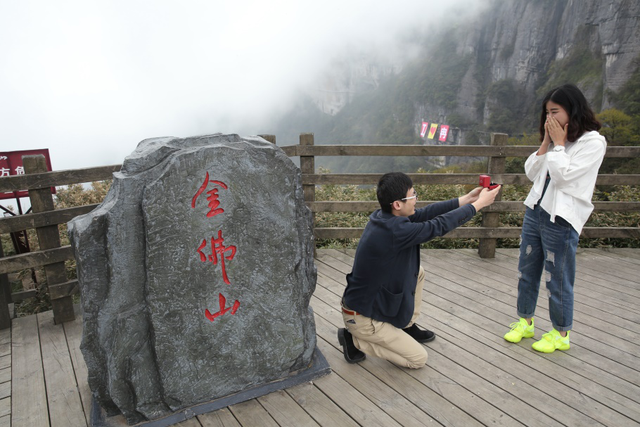 300平米的巨幅情书、千米悬崖表白、闪亮大钻戒……昨日,重庆小伙小盛花费巨资精心规划的浪漫求婚现场,却被山崖上的一股风给搞砸了。因为低估悬崖风的威力,小盛花费巨资悬挂的巨幅情书,在金佛山千米绝壁栈道上说飞就飞,而女友的脸,也是当场说翻就翻。 现场:围观群众惊呼 大情书飞啦! “快看,悬崖上挂的是在表白呀!”“哇塞,这也太浪漫了!”“这个小伙子有想法!”……网友爆料称,昨日在金佛山景点金龟朝阳处,小盛和女朋友冉冉成了大家关注的焦点,因为小盛在金龟朝阳对面的绝壁栈道上,悬挂了总面积达300平方米的巨幅情书:“I ❤ 冉”,给相恋3年的女友冉冉求婚。从网友提供的图片上看,小盛制作的情书,以红黄相间的颜色,巨幅的面积,在悬崖绝壁上显得格外显眼。