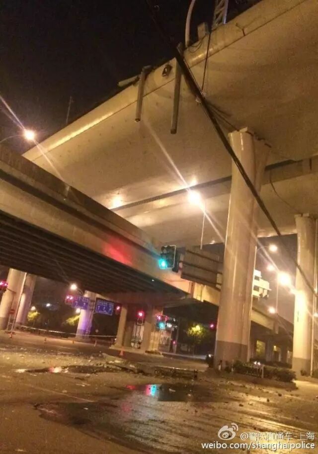 事发时,上海建景物流有限公司一辆装载十余米长预制水泥管桩的卡车(沪D39066),超载货物违章驶上高架道路,行至中环线(内圈)真华路至万荣路匝道之间时,发生单车侧翻事故,致使高架路段主桥面翘起损毁,桥面最大高差处约40厘米。肇事卡车所载的数十吨预制水泥管桩纷纷翻落,部分管桩坠下高架桥落至地面,导致高架及地面交通无法通行。事故现场无人员伤亡。