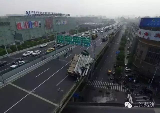 今天(23日)零时10分许,汶水路、沪太路口的中环线高架道路发生严重车祸,一辆超载货物的卡车违章驶上高架道路,发生单车侧翻事故,致使交通受阻中断。事故现场无人员伤亡,公安部门已着手调查事故原因。