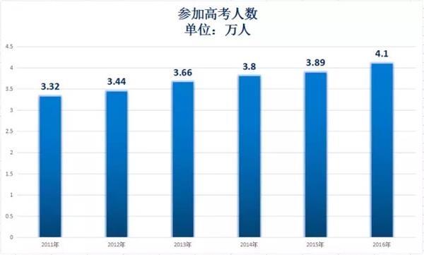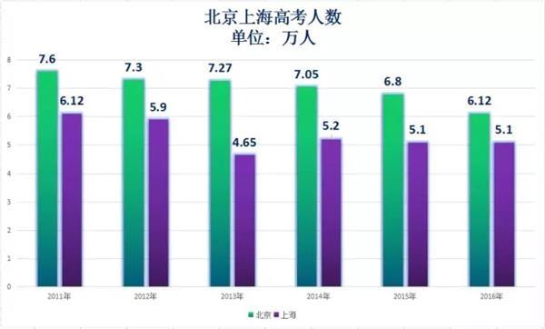 4 ?+ @- d3 G$ L2 @+ g' F: v北京最近6年,高考人数一直在减少,从2011年的7.6万人减少到现在的6.12万人,减少了19.5%。而上海,高考人数先减后增然后再减,呈现波动性,但总的来说还是减少了1.02万人。尽管最近6年,北京和上海小学生人都在增长,北京增长了30%,上海增长了14%,但高考的学生人数却在流失。 再来看看,全国高考人数是个什么情况。