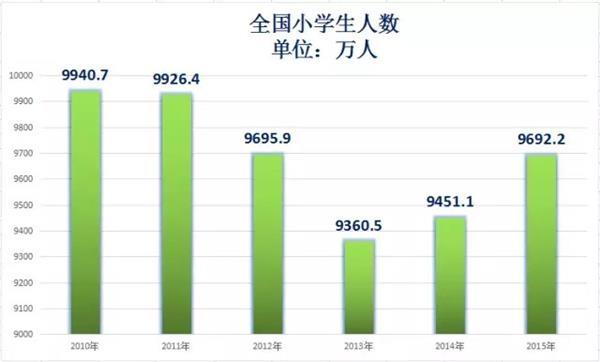 7 j0 p! [$ M f$ c全国高考人数也是呈现震荡,2016年全国高考总人数为940万。这一人数相比于2011年的933万人,增加了7万,但是相比于2008年最高峰时期的1050万人,少了110万。 而全国的小学生人数也减少了不少。