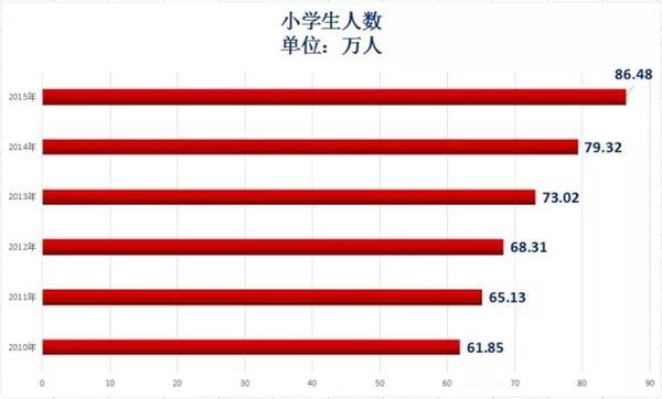 上图可以看出,深圳近六年来高考人数一直在不断增加,从2011年的3.32万人增加到了今年的4.1万人,增长了23.5%,这个数据可以侧面也反映深圳人口增长情况。 大家肯定认为,高考人数来反映人口增长有点片面,因为许多人可以选择出国,读中专和技校。但是,若将这些人加进来,人口只会增加的地更猛。尽管,高考人数不能很好地反映出人口增长的实际情况,但是总的趋势是不会错的。不信你来看看深圳近六年小学生人数增长情况就知道了。 , C6 |4 F: |7 Q0 g9 t