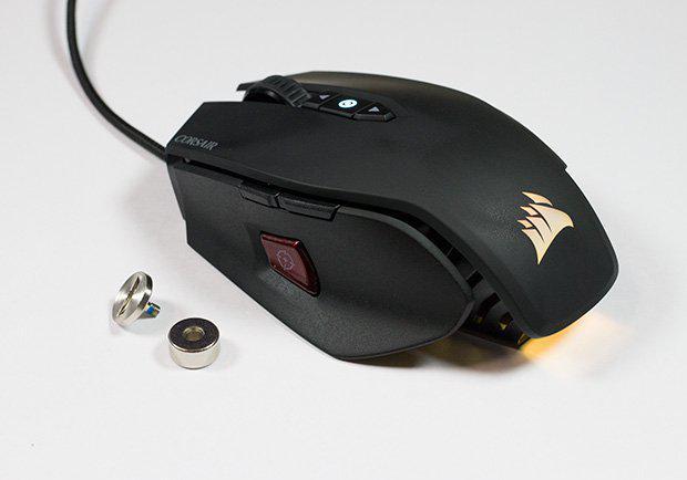 海盗船M65 Pro RGB模具基本沿用系列,在机身底部可以看到三个重量砝码槽,用户可以按照需求进行调节。另外,它增加了16.8M色RGB灯光,灯光部分主要集成在机身后部Logo及下方。