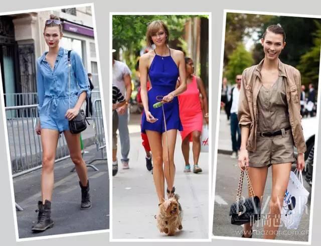 Karlie Kloss 超模KK总能把连身短裤穿出休闲时髦的感觉,一身水洗蓝或烟灰色连身裤率真自然,本就逆天的两条大长腿在抽绳腰带的修饰下,胸部以下全是腿,偶尔来件吊带连身短裤,淑女的优雅也是无法挡~