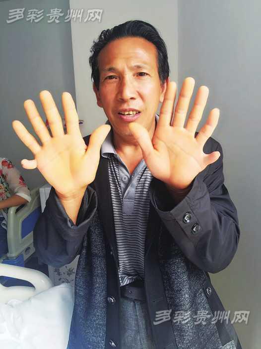 刘天书双手上的多指情况,他的每只手都有6个指头。 延伸阅读 重复肾系先天畸形发育 1000人中,8人或有重复肾 王开炼的4个肾到底是怎么来的?这么多肾到底好不好?面对记者的疑问,梅傲冰介绍:“重复肾具有遗传性,是先天畸形发育形成,在胎儿胚胎发育4周左右就形成了。”畸形的重复肾一般都跟正常的肾长在一起,有些会形成像王开炼这种具备供血和泌尿功能的正常肾,有些也会出现多个肾共用供血和泌尿系统的情况。 一般来说,重复肾根据发育情况、肾积水和肾界限分成五型,如果属于有积水等前三型病变情况,一般要通过手术治疗。而发育正常又没有积水等病变的情况,不会影响人体功能,也不需要做手术治疗。 有资料显示,自1656年首次发现重复肾以来,全球仅有百例左右报道,国外专家分别在1970年和2002年报道了双侧额外肾患者共4例。放在贵州全省来说,重复肾也不多见。除了《贵州都市报》曾在2012年报道过印江一名42岁的女子患有4个肾合并肾结石外,暂时查询不到更多的重复肾记录。“医学上重复肾的发病几率数据不统一,比较权威的资料显示它的发病概率在0.8%左右。”梅傲冰说,重复肾除了有4个肾的情况外,也还有3个肾、马蹄肾等多种畸形肾脏。 按照0.8%的发病概率推算,1000个人之中,或许就有8个人患有重复肾。那为什么现实生活中,重复肾如此少见呢?“这是因为发现率很低的缘故,一般人如果不发病,也不容易发现重复肾的情况。”梅傲冰说,很多重复肾是发育畸形的,如果不是剧烈运动引发血尿感染,或者反复感染,一般也不会去刻意检查,普通的体检也不一定能查出来。 既然多两个肾,那么能够把多余的捐赠移植给别人吗?梅傲冰说,这可不行,虽然总体功能与正常人相差不大,但是因为每边的两个肾都是连在一起的,属于“连体肾”,不仅手术难度大,就算同侧的肾取出一个后,另外一个患病风险特别大。且肾移植对肾静脉动脉长度有一定的要求,畸形肾满足不了,所以捐赠移植不可行。