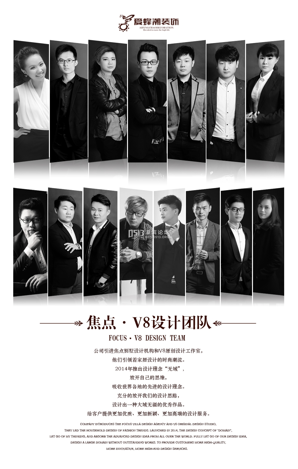 自公司成立以来,始终坚持“以客户的需求和满意为工作标准”的核心,并在业内率先提出“无域”的设计理念。设计团队由焦点别墅高端设计工作室与V8原创设计工作室组成,并对软装配饰、园林建设、结构改建、风水等专业有深入化研究,以一个完整设计团队的服务模式为客户提供全方位一站式的服务。