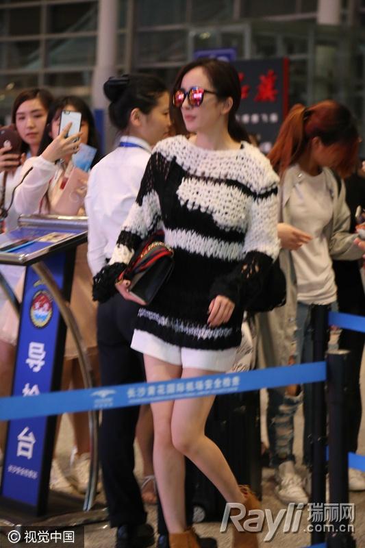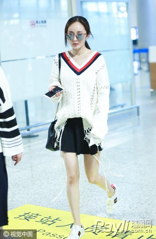 近日,杨幂现身长沙机场,身穿黑白相间的破洞针织衫搭配白色超短裤,大秀竹竿腿。针织衫破洞款隐约露肤也是潮。
