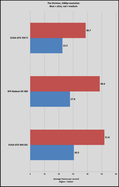 《汤姆克兰西:全境封锁》是育碧今年推出的开放世界第三人称RPG射击游戏,采用雪莲花引擎,对显卡性能要求较高。通过测试结果可以看到,AMD RX 460在1080P高画质及中画质效果下,帧速率表现均超过了NVIDIA GTX 750Ti,但提升效果基本在5至10fps左右,不是非常明显。要知道,GTX 750Ti已经是上市两年的老将了。
