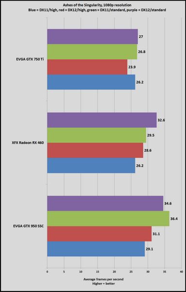 《奇点灰烬》这款游戏支持DirectX 12,所以可以测试出AMD RX 460对其的支持表现。可以看到,在DX 12模式下,AMD RX 460同画质拥有约3fps的性能提升,表现无疑更好一些,但10%的提升幅度似乎没有什么太大作用。