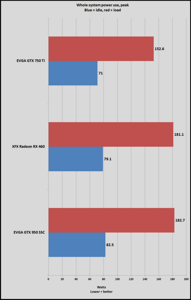 PCWorld还测试了AMD RX 460的功耗及散热性,通过运行4K分辨率的《全境封锁》取其峰值数据、在Windows桌面闲置三分钟取其闲置数据,发现AMD RX 460的功耗实际上要比GTX 750Ti更高一些,另外也更热。