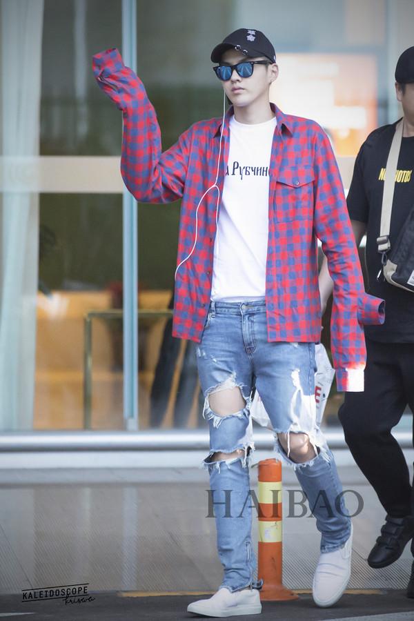 少女时代组合成员崔秀英2016年7月15日韩国仁川机场街拍 (飞日本大阪) 秀英是会穿的,红蓝对半撞色的格纹衬衫经典不乏新意,彰显青春活力,搭配牛仔热裤,小白鞋,典型的早秋中性风Look让人好感度UP!