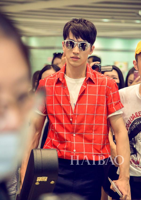 许魏洲这套红色白条格纹衬衫半袖真是让人惊艳不已,原来男生穿这种高饱和度的橘红色也相当帅气!