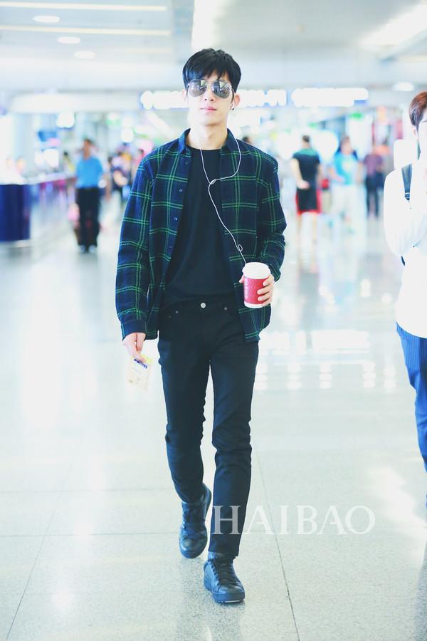 井柏然最新机场街拍,身穿Carven 2016秋冬系列格纹衬衫,绿色线条穿梭于TotalBlack的造型中显得精致,品位上游!