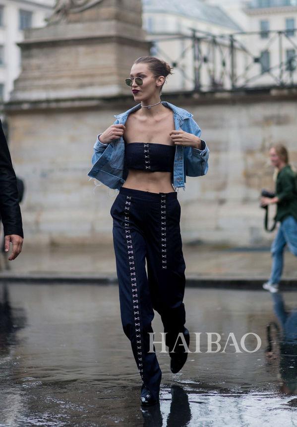 图片来自imaxtree\东方IC 吉吉·哈迪德 (Gigi Hadid) 街拍贴花牛仔裤