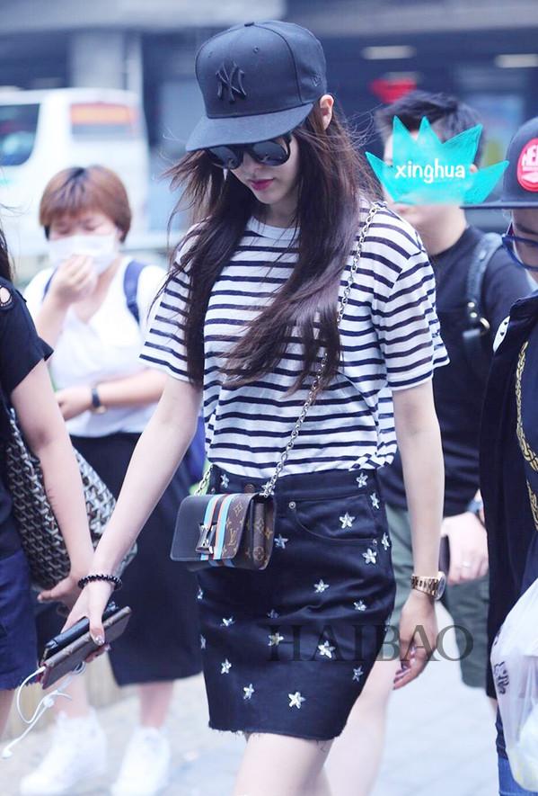 少女时代组合成员崔秀英2016年8月7日明星街拍:身着白衬衫搭配Gucci刺绣牛仔裤,搭配同品牌刺绣运动鞋,拎Bao Bao IsseyMiyake手袋参加《38师机动队》的终映聚餐