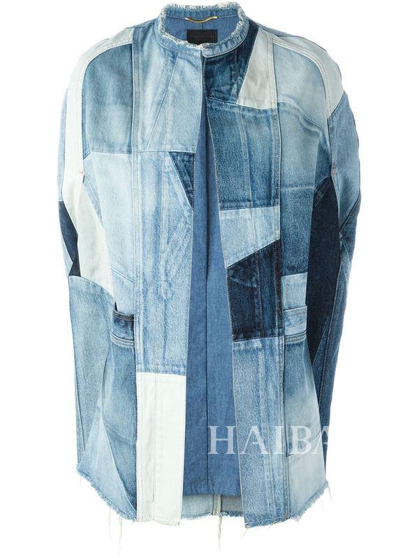 娜扎这套Saint Laurent牛仔拼接斗篷,看点颇多:毛边小立领、不规则的几何拼贴、凌乱的线条走势、帅气的廓形……根本让人移不开眼球。