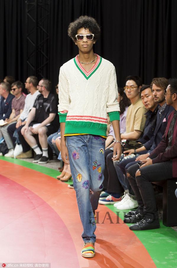 贴花用在裤子上,同样引人注目,小心机带来大功效!PaulSmith男装秀上的俏皮贴花,可是让有板有眼的直筒牛仔裤,瞬间变成小顽童的复古宝藏。