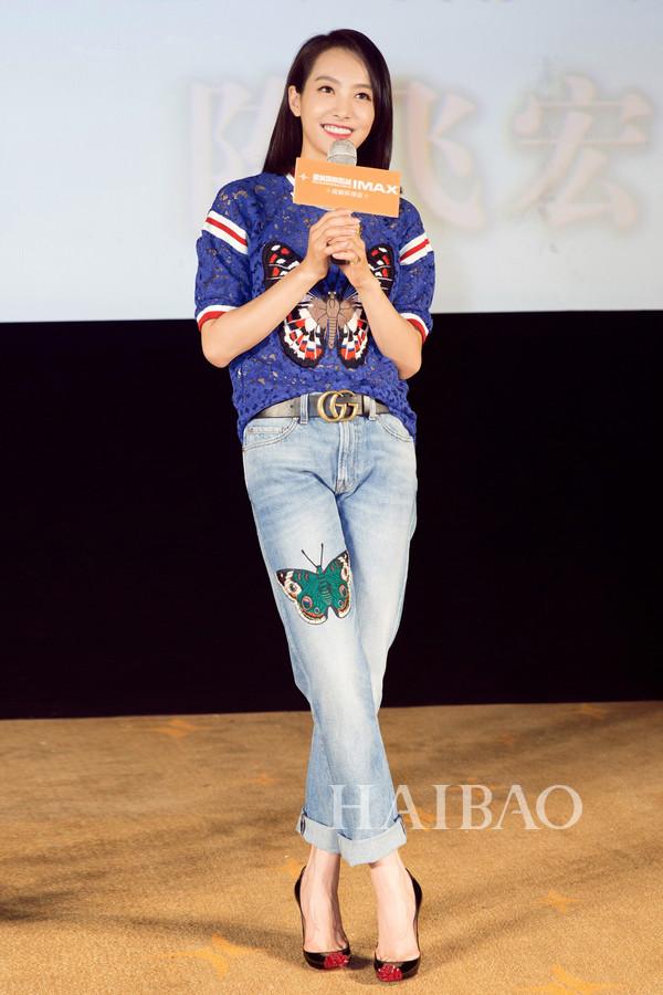 图片来自艺人工作室/经纪公司 宋茜身着Gucci 2016早秋系列镂花上衣+贴花牛仔裤现身《我最好朋友的婚礼》的成都“路演”