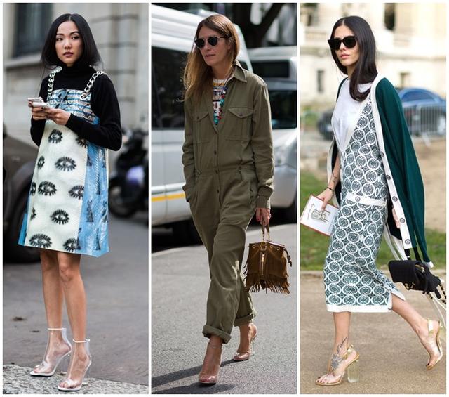 除了女明星,时尚圈儿也是很追捧哒! 时装周街拍里有不少人穿。这些透明鞋子看起来,可正经了呢。