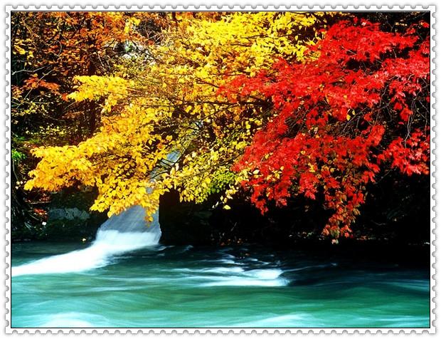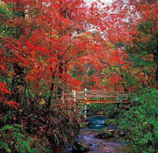 这里有广阔而美丽的草原,生长着满山的莨茗红叶,色彩浓艳夸张,而被红浪所包围的藏民村庄、田野,则显得非常的朴素和安祥。 辽宁丹东天桥沟 位于辽宁省丹东附近的宽甸县境内,为新近开发的红叶观赏区。