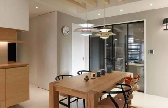 长方形的原木餐桌,平时吃饭过后,可以和孩子一起坐在上面写写画画。 # h: K: |$ J2 o6 ^% V# s
