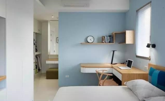 主卧室家具都是纯木色的,为了不至于太过单调,墙面都是淡蓝色。 # P' Z% `" \2 p# ~# [; k% y u