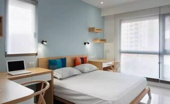 ! u; K/ V$ R, d% Z5 B卧室的空间也不是很大,利用简单的床品更清新有益于睡眠,也显得格调有内涵。