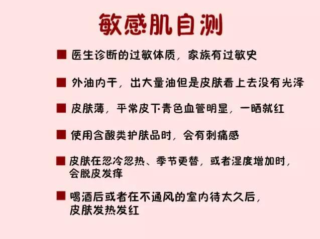 秋季虽然美好,但是对于一部人来说可能是噩梦。秋季过敏的几率很高,容易过敏的亲故们要注意的事项有很多,估计出门都想把脸全部罩住了~莫方,其实敏感肌并没有那么可怕。 敏感肌VS过敏肌 很多亲故以为过敏肌和敏感肌是一样东西,这是误区。简单来说可以说敏感肌的人比较容易变过敏肌。 过敏肌肤是一种皮炎症状,是外界致敏物质在体内抗体结合的IV变态反应引起的皮炎症状。指已经产生皮肤炎症症状的皮肤。 敏感肌肤是指肌肤比较脆弱,易过敏,但是还没出现皮肤炎症。需要特别护理的肌肤。 如何判别敏感肌? 如果你√多于三个,那小编很抱歉地通知,你基本上属于敏感肌。 你的肤质比较脆弱,抵抗力较差,水分“经皮肤蒸发”的速度比一般人快。平常注意饮食休息外还要选择适合肤质的护肤品!不注意乱用一通过敏只能哭着找医生! 敏感肌不可以用什么? 很多亲故觉得自己是敏感肌就要使用天然无人工成分的产品就妥妥的。其实只有避开以下这些,才是万无一失的。 ①精油 精油里面通常具有过敏原,对于皮肤的负荷比较大。所以在选择精油上要非常注意,而且尽量少用。怎么选?一、高品质天然萃取物的精油,最好选择口碑大牌;二、低浓度 ②含果酸、水杨酸、维生素A酸等类产品 这些成分的产品会对皮肤有角质剥落的作用,敏感肌大多都是肌肤保护层偏薄的情况,不太适合使用,容易导致过敏。所以亲故们在成分表上要看清楚这些字眼。 如果一定想要使用,只能在冬季使用,同时要简化其他配套的护肤品,保湿为主。 ③含药物成分的产品 这里的药物成分是指化学药物。通常高倍度数防晒里面就包含,高倍防晒霜就是高浓度的化学性浸渍伤害。这种化学性防晒剂是引发过敏的成分之一,敏感肌要注意减少浓度和涂抹量。 使用低防晒值的产品,结合太阳伞、墨镜等物理防晒更好。 ④浓度过高的活性成分产品 活性成分浓度过高,会造成肌肤的营养过剩。尽量减少像精华那样的高活性产品不同牌子混着用。 ⑤含界面活性剂、防腐剂、香料等产品 为了清洁皮肤同时让保湿的成分渗透,护肤品都使用了界面活性剂。但是接触越多界面活性剂,皮肤会越来越粗糙敏感。而香料、防腐剂更是很容易渗入皮肤角质层。对于敏感肌来说是很大的负荷。 尽量选择无香、保质期短、容量没那么大的产品,广口瓶的产品也尽量避免,细菌易入侵。洁面产品要选不容易起泡的。化妆水也需要起泡小的,泡沫小快消失的话证明它含有的界面活性剂少。 敏感肌可以用什么? 按照MK娘娘科普的传统护肤顺序,小编为大家一一种草敏感肌也能放心使用的产品~ 洁面 推荐敏感肌的亲故抛弃皂基,和氨基酸相亲相爱哦。敏感肌最重要的就是补水保湿,皂基类产品过干,只适合油皮混油。