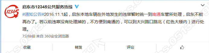 通知:2016.11.1起,启东本地车辆在外地发生的违章暂时统一到南通车管所处理 |