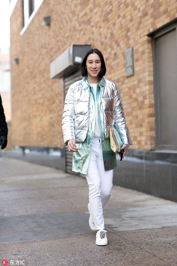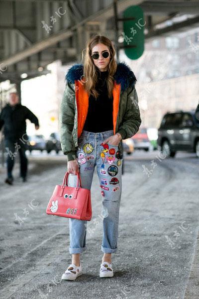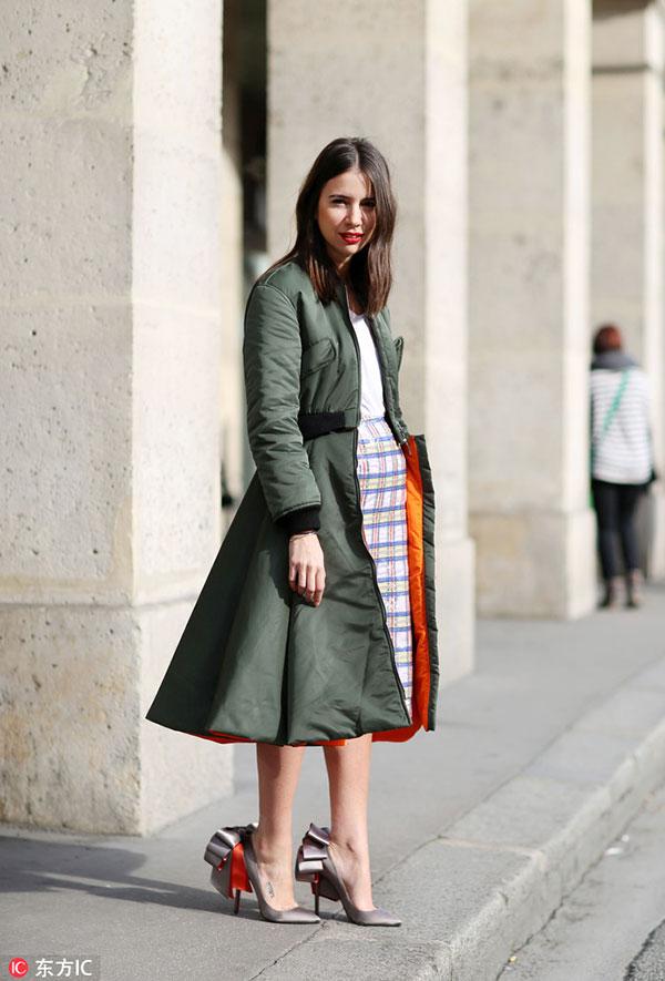 就算是纯色羽绒服,你也可以告别往冬的“经(老)典(套)”三原色,转而去选择一些特别而醒目的色彩,让你的羽绒服从色彩重灾区变成冬季玩转颜色的利器,成为羽绒服里的一股清流: 还有从今年春夏秋一直延续入冬的金属色: 以及帅气的军旅色彩,羽绒服也同样可以“伪装”成深受青睐的飞行员夹克: 三、Oversize容易邋遢不保暖,合身更聪明: