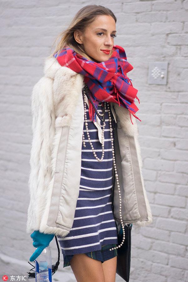 红白格纹长丝带让本来沉闷的黑色羽绒服顿时生动起来,更与夸张的领口设计形成对比。