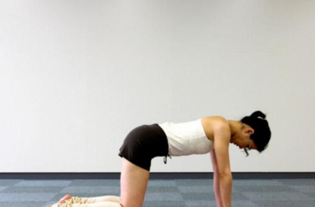 一、以四肢撑地的姿势开始 双手撑着地板,双脚则是跪着、膝盖弯曲九十度,间隔大概是两个拳头大小。眼睛视线则是朝下,吸气收紧小腹。
