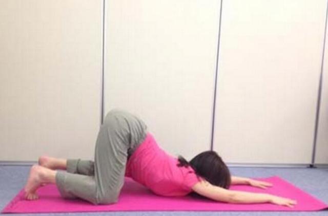 二、伸展背部并缓缓向前移动 保持小腹紧收的状态,一边模仿猫叫声一边缓缓吐气并向前慢慢伸展背部肌肉。一边有意识的控制呼吸及动作,一边注意大腿及臀部不要太过突出就是重点喔!