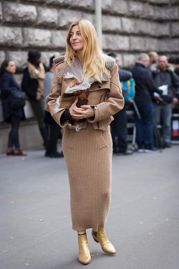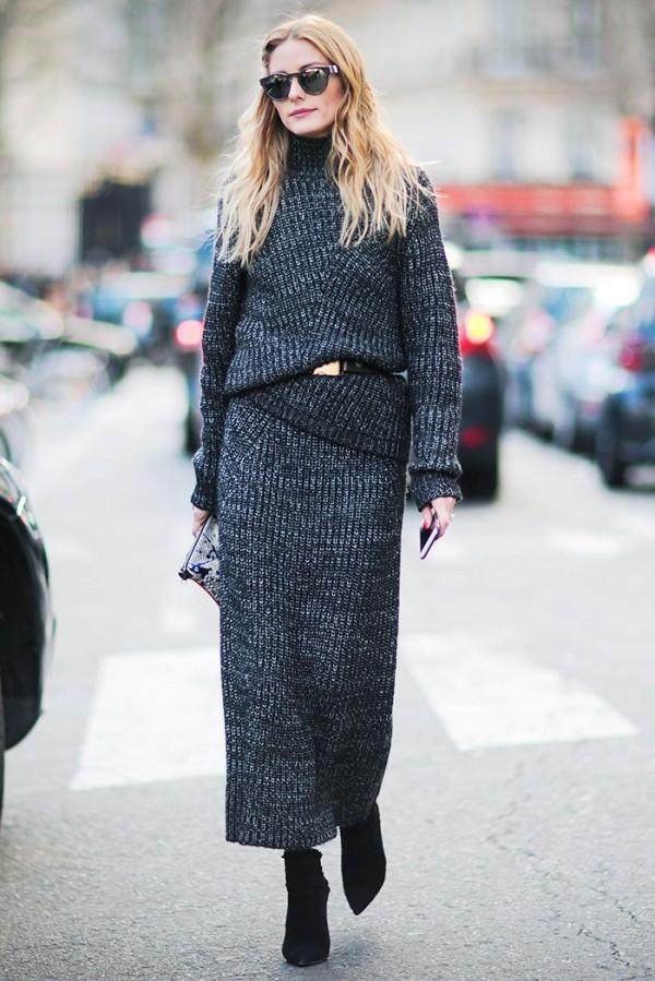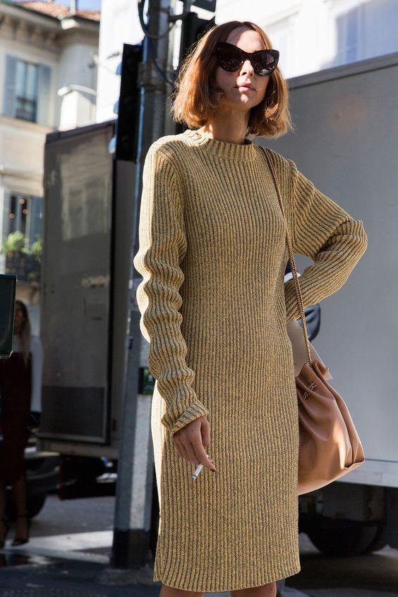 温馨提示:街拍套路深,时尚icon总是有着过人的体格能在雪天光腿拗造型。将温暖舒适摆在第一位的“实穿icon”,请根据温度添加保暖裤。 1.垂坠的质感 夏天,我们总爱丝质裙,因为它垂坠的质感总是特别起范儿。而冬天穿裙子其实也需要这种垂坠的效果来突显造型感。 推荐单品:针织裙 厚重的冬装想要营造垂坠的效果,就必须要选择一件分量感够足的裙子。比如,针织裙。 针织裙特殊的结构可以让裙摆在厚重的内搭之外同样呈现出一种垂坠动感的视觉效果,保留裙装应有的造型感。 和其他单品搭配时,针织裙也会看上去更协调自然,不会有某些反季节单品的违和感。 同时,针织裙的面料厚度也决定了它确实要比其他面料的裙装更加温暖。嫌弃毛裤不洋气的人,大可以选择针织裙御寒。 和毛衣一样的材质让针织裙无需费心打理,更不用担心什么叠放不妥导致破坏廓形。 对比出真知: 同样是穿裙子,有分量的针织裙明显看着更有质感,搭配起来也更协调。
