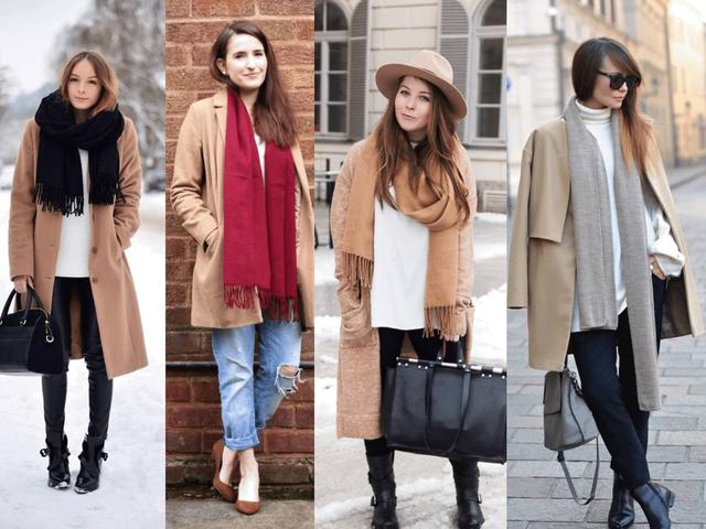 我们先来看一张图: 大家可以发现,同样是相同的黑色大衣一身黑,配上不同颜色的围巾就会有完全不同的感觉。 我们再来看一下驼色大衣,也是相同的效果,不同颜色的围巾给驼色大衣也带来了截然不同的感觉。 所以,围巾在搭配里最重要的一个作用,除了御寒以外,就是起到核心配饰改变服装造型整体风格的作用。 围巾能够让平淡的基础款瞬间就有了生命力和跳跃感。 的颜色可以「点亮」低饱和度的整体造型,就像白色蛋糕上的樱桃一样。 而也能够让相同类型的衣服有着: 所以说啊,如果你有很多条不同颜色、不同款式的围巾,哪怕只有一身衣服,也可以穿出很多套衣服的效果。