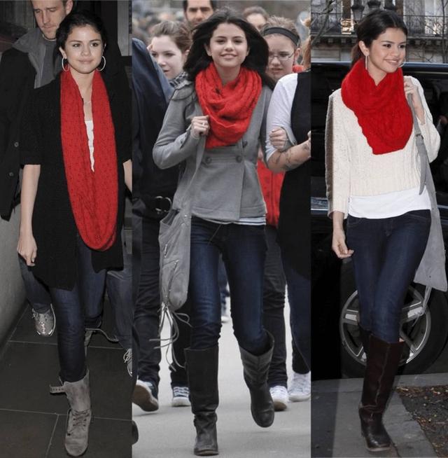 红围巾 如果说到「点亮」冬季一身黑白灰的话,红色可能得排第一位了,也是全身黑白灰的时候想「跳出一些」的好选择。 Selena Gomez 就特别喜欢红围巾。娃娃脸穿黑白灰基础色总是觉得很沉闷,加了红色以后,也能让普普通通的搭配变得有意思一些。 红围巾和红包,或者红围巾和红鞋子,。但是注意,新手千万不要超过 2 件呼应,很容易就会「做过头」。 这里需要注意的是,并不是每个人都适合红色。而且,红色也有冷暖之分,偏玫红的冷红色,偏橘红的暖红色。