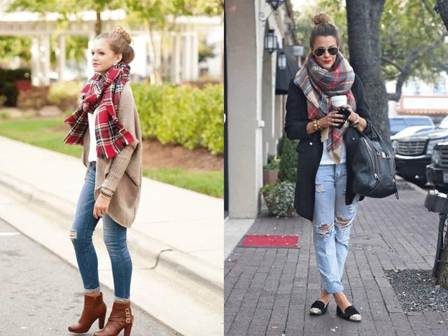 如果你是上班族,可以选择同色系的格子围巾。相对于上面这种基础款+随便一条格子围巾,同色系搭配会更加优雅成熟精致,感觉更有内涵和气质。 还有一种颜色搭配,就是选择啦。比如下图最右边,格子围巾的主色是黑绿,但是围巾里也有一点深紫色,和妹子身上的紫毛衣相互呼应,这种搭配也是很和谐的。 格子围巾的总体颜色和鞋子呼应也是一种好办法,前提是上装下装也都保持素色基础款,不然会看着乱七八糟的。 格子围巾并不是完全百搭的,我们来看看什么不能搭。 上图的格子撞条纹,下图的格子配格子,这两种都属于高段位穿法,穿好非常难,新手最好也不要尝试。