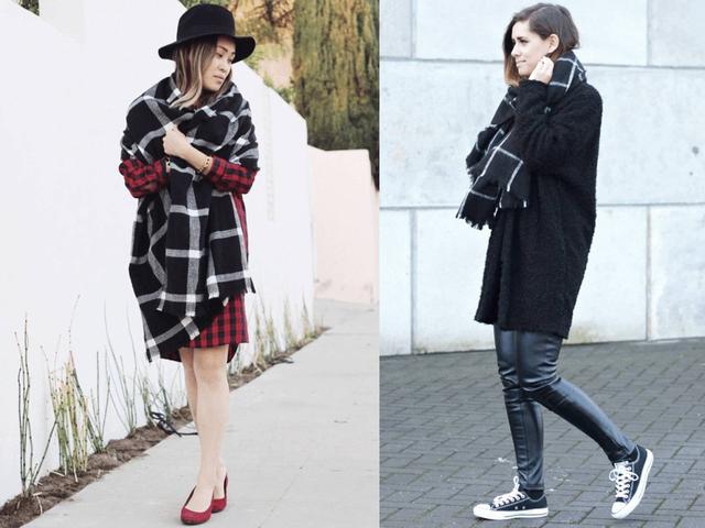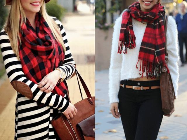 选择的时候最好还是去店里自己戴着看看,能让你觉得一戴上就「特别显气色」的颜色就是适合你的颜色。 ▍单品推荐 格子围巾 如果觉得使用大面积红色围巾还是需要一些勇气,觉得太扎眼,但是又觉得灰色围巾过于暗淡,那么格子围巾就是很好的折中之选。 同样一身黑的搭配,而右图的花围巾则增加了女人味和精致度,但同时也有让人显得更加成熟的效果。格子围巾在保留了灰色围巾的休闲度的基础上,增加了跳跃感,又不像右图的花围巾那么跳跃。