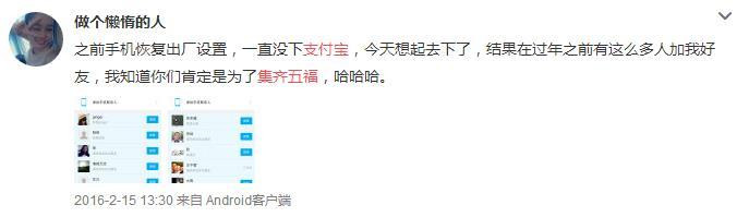 记得去年,支付宝公布集五福玩法后,各类有关支付宝五福的微信、QQ群崛起,无非就是让支付宝用户加更多的好友嘛,以借助此红包活动培养支付宝用户的社交习惯,可并没有多少卵用的啊。 可是一句“集齐 5 福平分两个亿”的口号,支付宝早已把网民的理智降低到冰点,被撩的完全挺不住啊。2个亿啊,买彩票什么的一边去,待我攻破集齐支付宝五福的秘诀。 妹子你这是脾气好,换做是脾气不好的,早就...砸手机了。